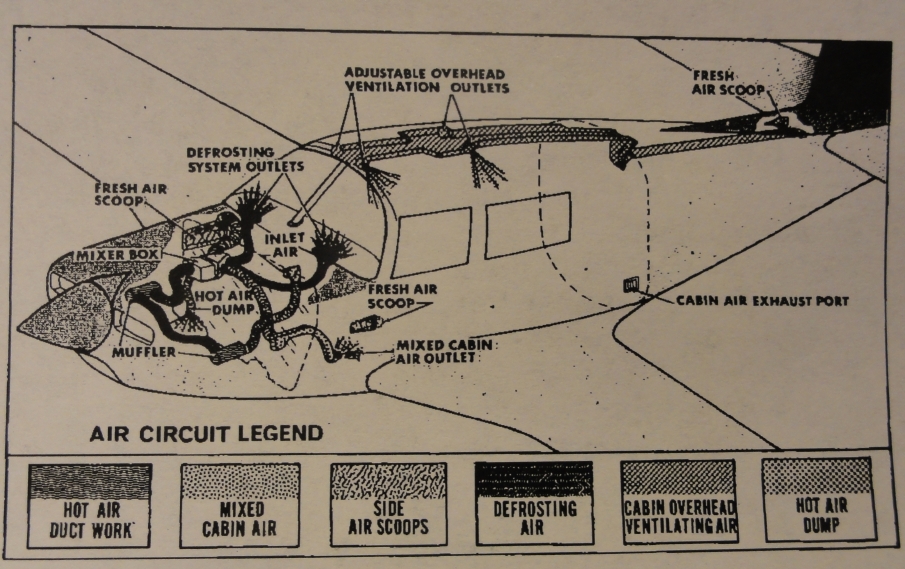 Frischluft kann durch Lufteinlässe auf der Piloten und Copilotenseite in den Fussraum gelangen. Unabhängig davon wird jedem Sitz Frischluft von oben zugeführt.