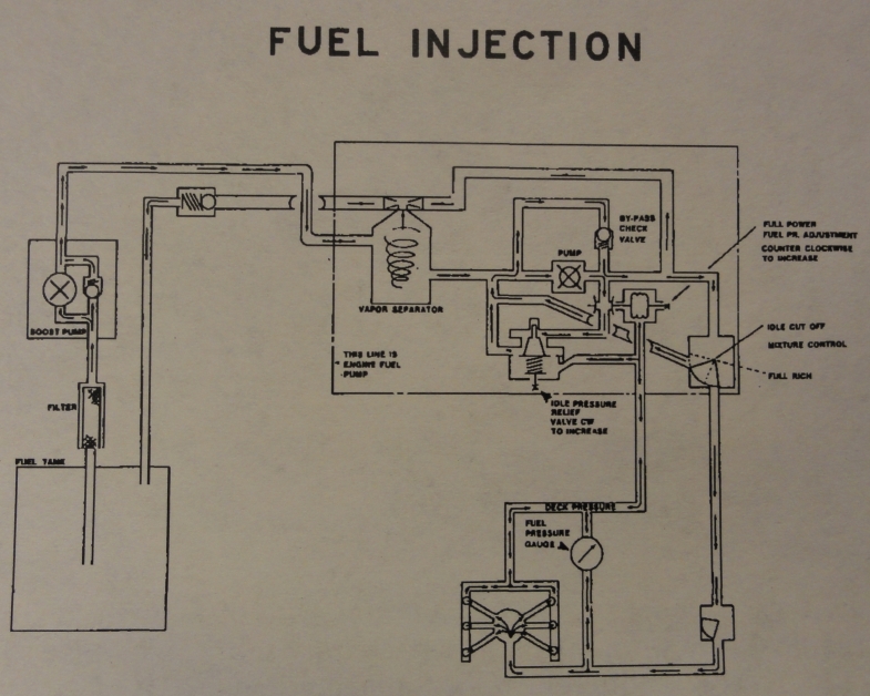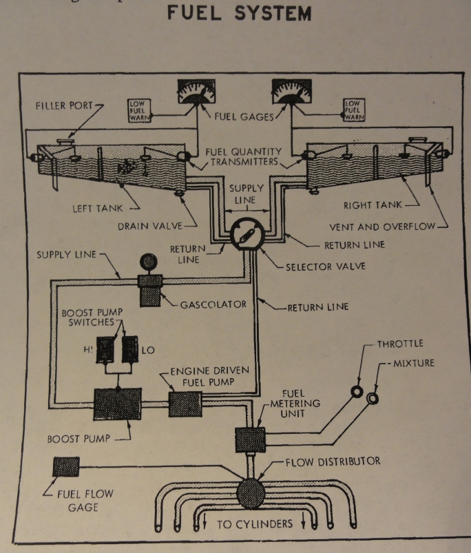Der Tankwahlschalter hat drei Positionen: Rechter Tank, linker Tank, Zu. Links vom Tankwahlschalter ist der Zuggriff für ein weiteres Entwässerungsventil. Es dient der Entwässerung der Kraftstoffleitungen. Der Kraftstoff fließt vom gewählten Tank über die elektrische Benzinpumpe zur motorgetriebenen Benzinpumpe. Sollte letztere ausfallen, kann die elektrische Benzinpumpe allein den erforderlichen Druck für volle Triebwerksleistung aufrecht erhalten.